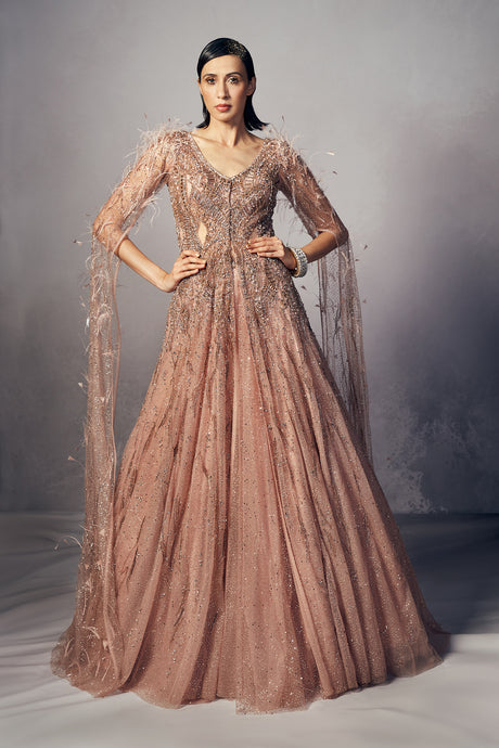 • Bessie Shimmer Tulle Floor length gown with cape sleeves