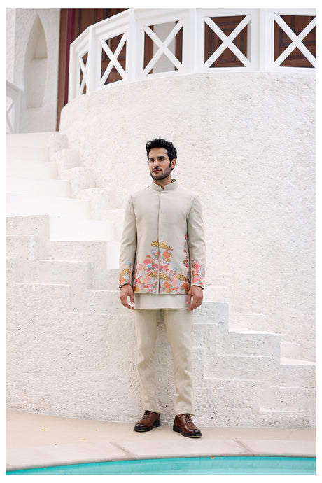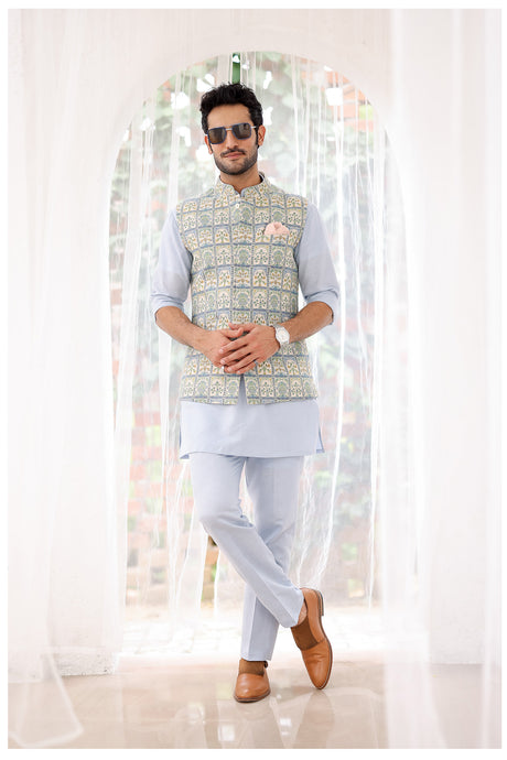 Sky Blue Floral Design Bandhgala with Pink Kurta