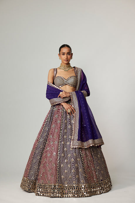 • CRANBERRY MULTICOLOR LINEAR LEHENGA WITH SWEETHEART FULL SLEEVE BLOUSE.