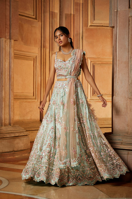 SOFT SAGE GREEN TULLE LEHENGA CHOLI AND BELT WITH A BLUSH INK DUPATTA